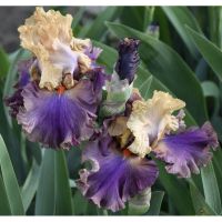 Довольно ранний ирис с желто-бежевыми стандартами, с фиолетовой спинкой и сиренево-фиолетовыми фолами плавно светлеющими к краям. Бородка ярко мандариновая.