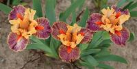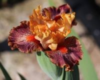 M - среднего срока цветения; очень яркая двухцветная пликата: желтые стандарты и телесно желтые фолы с бургундским рисунком пликаты и крупной мандариновой бородкой.