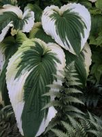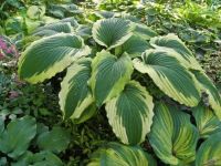 Красивейшая хоста-Шедевр! Куст фонтанообразной формы. Листья зеленого цвета с выраженным жилкованием и волнистым очень широким перьевидным светло-желтым, а позднее белым краем.