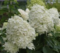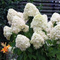 Гортензия метельчатая: Фантом — сорт отличается очень крупными красивыми соцветиями. Конические соцветия при распускании светло-кремовые, затем меняют окраску на розовый. Цветение обильное с июля до октября.