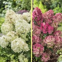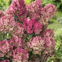 Гортензия Петит Стар (Маленькая звезда) метельчатая - Куст компактный, высотой 55 см и шириной 95 см, что делает его идеальным растением для выращивания в больших горшках. Соцветия плотные, длиной 15 см и шириной 15 см, во время полного расцвета покрывают всё растение. Цветки вначале салатовые, быстро меняют цвет на белый, в августе появляются розовые тона, а в начале сентября цветки полностью окрашиваются в красный цвет. Цветение обильное, с июля до октября. Жаростойкость очень хорошая. Место солнечное. Почва влажная, дренированная.
