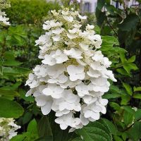 Гортензия метельчатая Левана - пышный крупный кустарник с ассиметричной кроной. Цветение очень обильное и продолжительное. Цветет крупными соцветиями (до 50 см), в начале цветения снежно - белыми, затем слегка розоватыми. Отдельные стерильные цветки очень крупные (до 5 см). Цветет 2-3 месяца, начиная с июля. Один из самых душистых сортов метельчатой гортензии. Листья шершавые, широкие, зеленые, без выраженной осенней окраски. Декоративность. Цветки крупные, 5-7 см, собраны в огромные соцветия до 50 см длиной, белоснежные, с медовым ароматом. Использование. Используется в одиночных и групповых контрастных композициях при декорировании цветочных садов, зеленых опушек, в качестве живой изгороди. Характеристика растения. Светолюбива, выносит полутень. Зимостойка, молодые растения в суровые зимы обмерзают, с возрастом зимостойкость повышается. Требовательна к наличию влаги в почве. Предпочитает плодородные, рыхлые, кислые почвы. Не выносит извести в почве