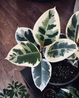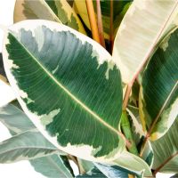 Декоративность в домашнем выращивании составляют красивые кожистые листья с глянцевым блеском. Они крупные (длинной до 30 см, шириной – около 15 см), в форме продолговатого овала с заостренной верхушкой. Прикреплены листовые пластины поочередно при помощи толстеньких черешков. Поверхность листа гладкая и блестящая, цвет – темно-зеленый, центральная прожилка слегка вдавлена. Оборотная сторона листа матовая, более светлого оттенка. Расцветка листьев многих выведенных сортов пестрая.