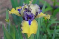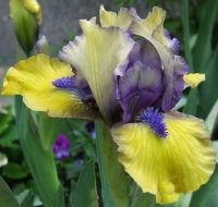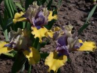 Желтые стандарты с плавным переходом в лавандовые края и насыщенные серно-желтые фолы с фиолетовыми плечиками у основания лепестков и сине-фиолетовой бородкой; очень необычная окраска