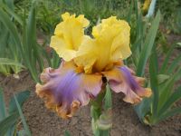 Лимонно-золотистые стандарты и желтовато-коричневые с сине-лавандовыми проблесками фолы с янтарными основаниями и окантовкой. Бородка-горчично-золотая. Сильно гофрированный.