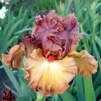 Стандарты - терракотово-сиреневые с сетью более темных прожилок. Фолы - терракотово-медовые с маленьким фиолетовым пятнышком ниже бородок. Бородки ярко-красные, выпуклые , большие.