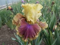 Стандарты - бриллиантово-желтые с кремовыми прожилками, фолы - розово-лавандовые, с фиолетово-лиловой полосой по центру с более темным жилкованием и желтой каймой, бородка - горчичная.